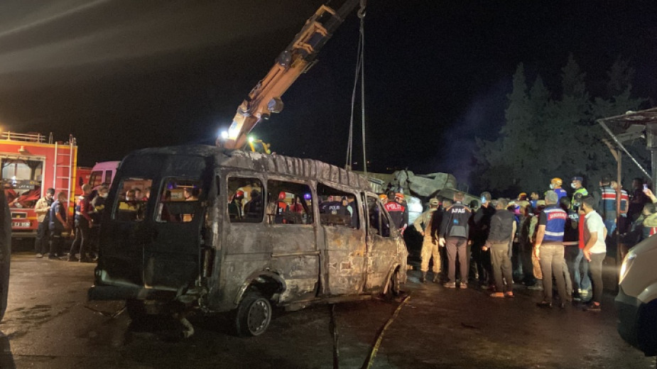 До катастрофата се е стигнало, след като шофьорът на камион е изгубил контрол над превозното средство и първо се е врязал във влекач, а след това е преминал в насрещното платно и е ударил девет автомобила и два микробуса. Камионът и двата микробуса са се запалили, информира турската телевизия НТВ.