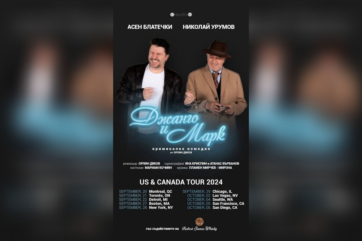 Актьорите Асен Блатечки и Николай Урумов ще имат турне тази есен в САЩ и Канада, съобщи БТА. Зад океана те ще представят пред сънародници криминалната комедия на Орлин Дяков "Джанго и Макс", информира порталът за българските идеи и каузи по света "Eurochicago". Турнето ще започне в Монреал на 20 септември и ще завърши на 6 октомври в Сан Диего. В Чикаго "Джанго и Макс" ще гостува на 29 септември. Представления ще има и в Торонто (21 септември), Детройт (22), Бостън (27), Ню Йорк (28), Лас Вегас (2 октомври), Сиатъл (4), Сан Франциско (5). Режисьор е Орлин Дяков, сценографията е на Ана Криспин и Атанас Върбанов, костюмите - на Мариам Кочиян, а музиката - на Пламен Мирчев-Мирона.