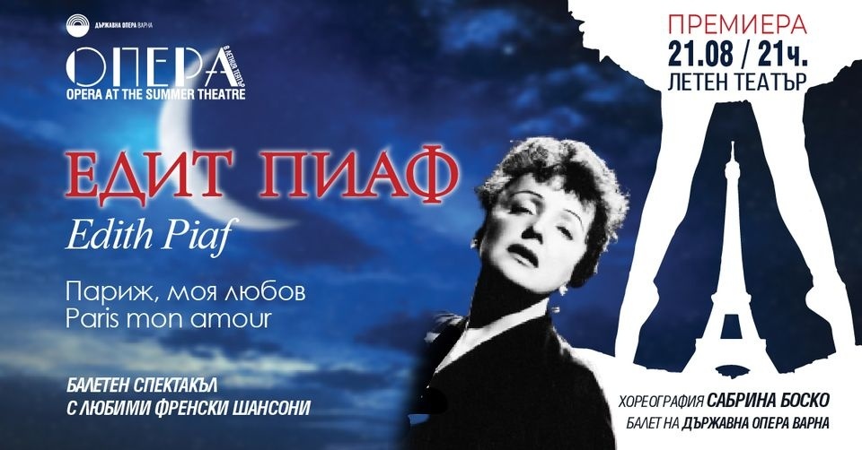 "Едит Пиаф - Париж, моя любов" - балетна премиера на Варненската опера, ще се състои на 21 август от 21 ч. на фестивала "Опера в Летния театър" в морската столица. Хореография - Сабрина Боско, солисти - Федерико Мелла, Мартина Префетто, Марко ди Салво, Летиция Росетти, Мирко Андреути, Джовани Помпеи, участва балет на ДО Варна.