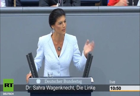 Пред 10 000 протестиращи левият депутат Сара Вагенктехт заяви: "Не искаме немски танкове да стрелят по правнуците на тези, които Вермахтът убиваше с милиони по най-жесток начин".