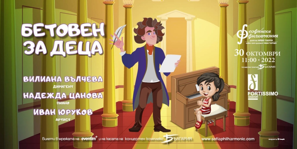 Бетовен е в зала "България" на 30 октомври в 11 ч. заради децата. В ролята на гениалния композитор се превъплъщава актьорът Иван Юруков, участва актрисата Сандра Петрова, солистка на концерта е Надежда Цанова (пиано), а диригент е Вилиана Вълчева. С музиката, изпълнена от оркестъра на Софийската филхармония, и новата музикална история на "Фортисимо Фамилия" децата и родителите ще научат много любопитни неща за живота и творчеството на великия виенски класик.