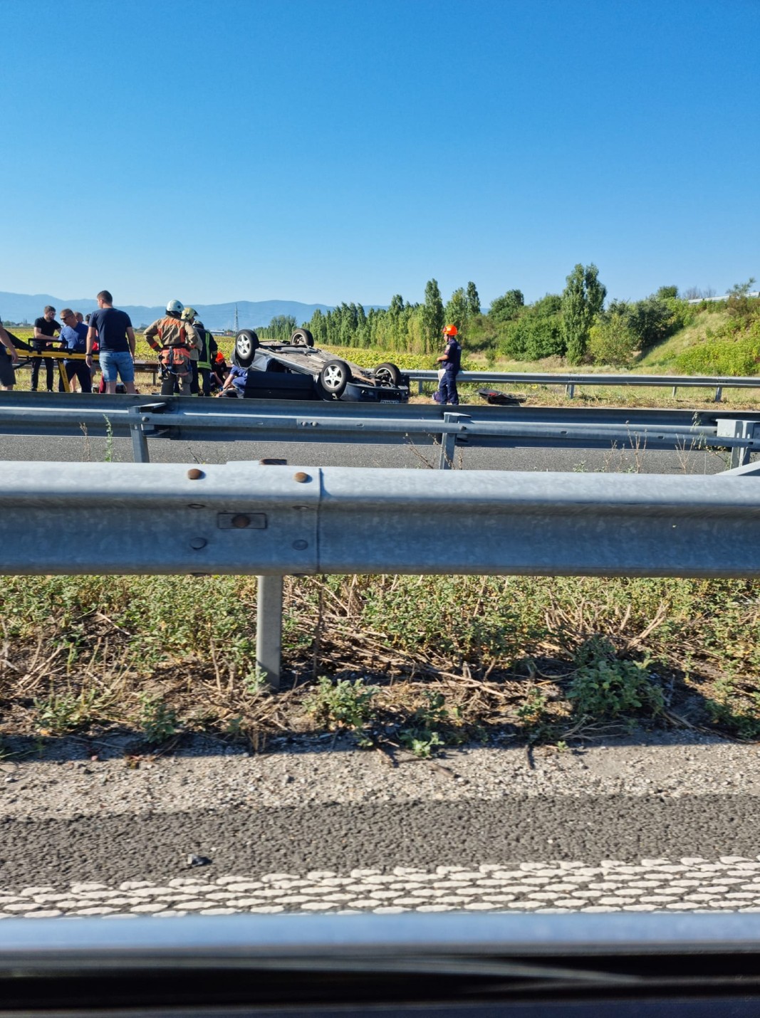 Към 9.30 ч. е приет сигнал, че край 127-км лек автомобил „Фолксваген” се е преобърнал на пътя, след като застигнал и блъснал отзад лек автомобил „Дачия”.