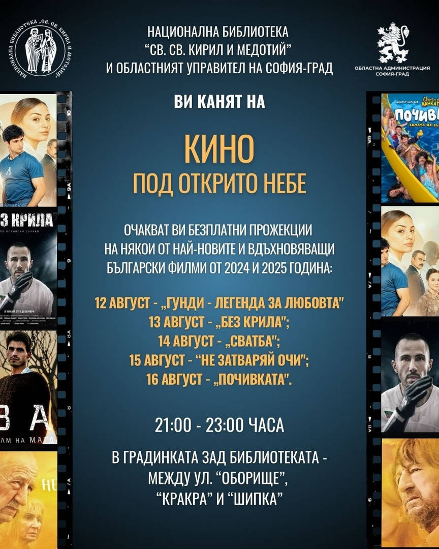 Прожекции под открито небе ще се състоят от 12 до 16 август в градинката зад Националната библиотека "Св. св. Кирил и Методий" в София, съобщи БТА. В пет поредни вечери ще бъдат излъчени някои от най-новите и вдъхновяващи български филми от последните две години. Програмата предвижда на 12 август да бъде прожектиран филмът "Гунди - легенда за любовта", а на 13 август - "Без крила". На 14 август ще бъде излъчена продукцията "Сватба", а следващата вечер - 15 август, "Не затваряй очи". В последната вечер ще видим най-гледаната българска комедия за 2025 г. - "Почивката". "Кино под открито небе" се вписва в мисията на Националната библиотека да съхранява и популяризира българското културно и книжовно наследство чрез съвременни и достъпни срещи с изкуството и словото. Събитието е част и от стремежа на администрацията на област София-град да подкрепя културата и да създава възможности за пълноценно лятно преживяване в града.