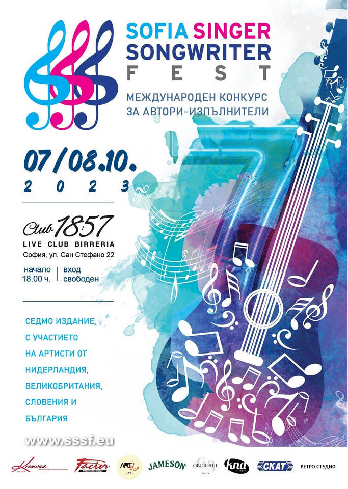 Покана да споделим емоциите на Sofia Singer Songwriter Fest 2023 - международен фестивал за автори-изпълнители, седмо издание, отправя Лили Друмева-О`Райли. Ще участват талантливи артисти от Великобритания, Нидерландия, Словения и България. Ще има и рецитали на призьори от предишни издания. Хубавата музика и атмосфера са гарантирани. Датите са 7 октомври, събота (полуфинал) и 8 октомври, неделя (финал). Мястото е Клуб "1857" в София, ул. "Сан Стефано" 22, срещу БНТ. Начало - 18 ч., край - 21 ч. Входът е свободен, но местата са ограничени. Водещ на програмата е Васко Громков (Dj Vagro).