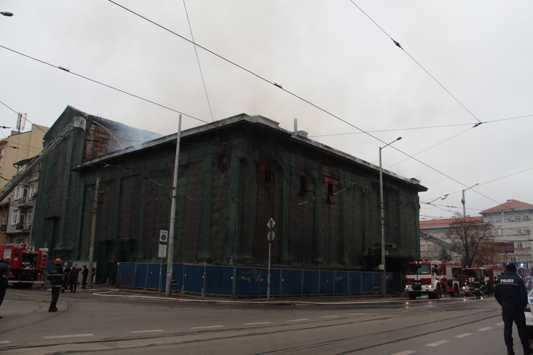 Огромен пожар гори в сградата на кино „Възраждане“ в центъра на София. Постройката е паметник на културата, преди години там се помещаваше емблематичната дискотека „Син сити“.