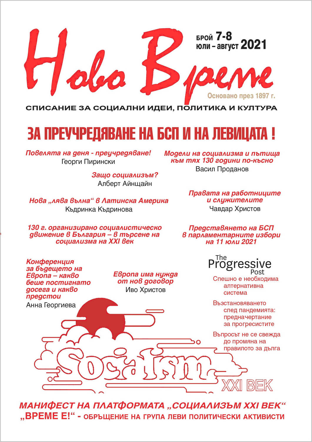 В дните, когато се навършва една година от първото заседание на 50-ия Конгрес на БСП (26-27.09.2020 г.), излезе от печат новият брой 7-8 за 2021 г. на сп. "Ново време" с водеща тема "За преучредяване на БСП и на левицата!".