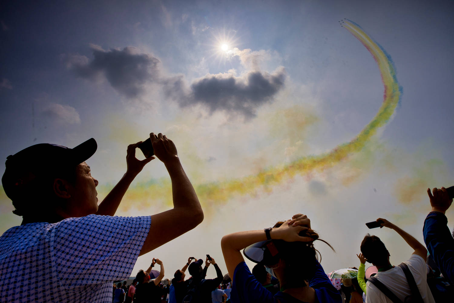 Китайци се любуват на висш пилотаж, демонстриран по време на 13-то Международно авиоизложение в Жухай, провинция Гуандонг. То започна на 28 септември и ще продължи до 3 октомври, съвпадайки с националния празник на страната, който е на 1 октомври. Китайското изложение на пътнически и военни самолети се смята за едно от петте най-добри в света.