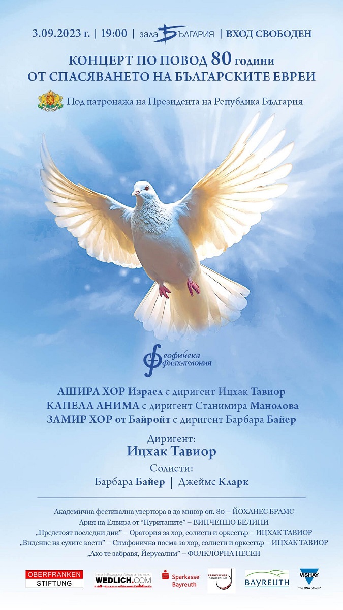 Концерт, посветен на 80-годишнината от спасяването на българските евреи, ще се състои на 3 септември от 19 ч. в зала "България", с вход свободен. На сцената ще се съберат четири музикални формации - Софийската филхармония, Ашира хор Израел (с диригент Ицхак Тавиор), Капела Анима (с диригент Станимира Манолова), Замир хор от Байройт (с диригент Барбара Байер). Диригент на вечерта е Ицхак Тавиор, солисти - Барбара Байер и Джеймс Кларк. В програмата - Академична фестивална увертюра от Брамс, Ария на Елвира от "Пуританите" на Белини, "Предстоят последни дни" - Оратория за хор, солисти и оркестър от Ицхак Тавиор, "Видение на сухите кости" - Симфонична поема за хор, солисти и оркестър от Ицхак Тавиор, "Ако те забравя, Йерусалим" - фолклорна песен. Концертът е част от специалните събития, посветени на важната роля, която България изигра по време на Втората световна война, спасявайки българските евреи от Холокоста, и се осъществява под патронажа на президента на Република България.