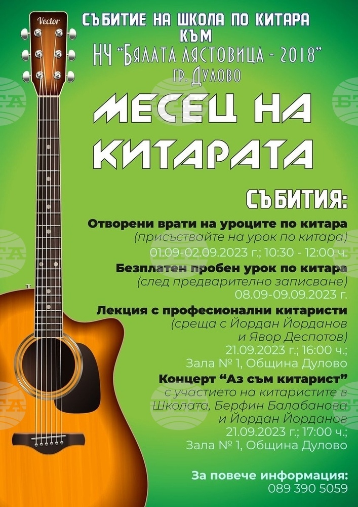 Школата по китара към Народно читалище "Бялата лястовица - 2018" в Дулово организира Месец на китарата от 1 до 21 септември. "Предвиждаме едно уникално събитие, което ще даде възможност на хората да се докоснат до магията на този красив инструмент. Надяваме се, че чрез тези активности ще успеем да популяризираме китарата като инструмент и да насърчим хората да се занимават с музика", заяви Светлозар Драгнев, ръководител на Школата по китара. По време на Месеца на китарата са предвидени Дни на отворените врати за уроците по китара и безплатни уроци за желаещите. Ще има и лекции от професионалисти, в които Йордан Йорданов от група "Фанданго" и Явор Деспотов ще споделят своите истории за началото на своята музикална кариера. За 21 септември, в залата на Община Дулово, е насрочен концерт със заглавие "Аз съм китарист", в който възпитаниците на школата по китара ще демонстрират наученото през годината.