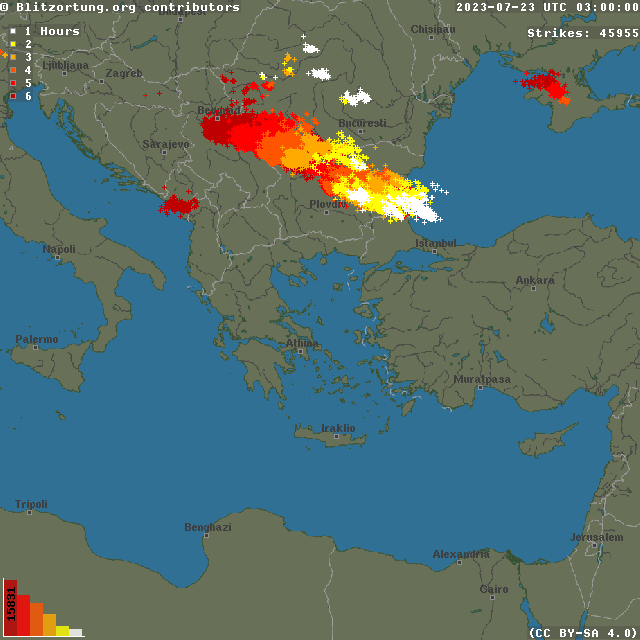 Серия мощни бури удариха страната ни в нощта на събота срещу неделя. Според радарите в тъмната част на денонощието над страната ни са паднали над 20 хиляди мълнии. Прогнозите за силна неустойчивост се оправдаха - ядрото на буреносния фронт навлезе у нас от съседна Сърбия малко преди полунощ и премина последователно през Северозападна България, през цялата Дунавска равнина и южно от Балкана от Сливенско, до централното Черноморие.