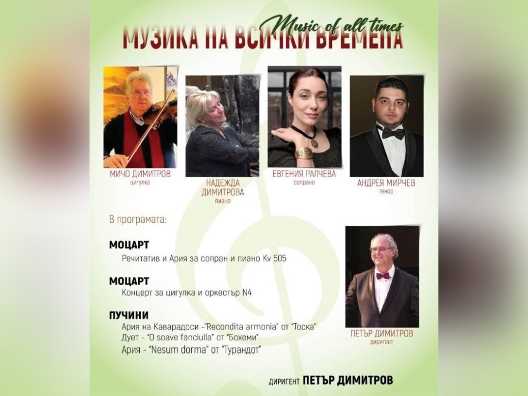 В концерта "Музика на всички времена" ще звучат Речитатив и Ария за сопран и пиано Kv 505 и Концерт за цигулка и оркестър №4 от Моцарт, Ария на Каварадоси от "Тоска", дуетът "O soave fanciulla" от "Бохеми", "Nessun dorma" от "Турандот" на Пучини.