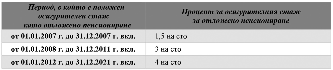 За всяка година действителен, календарен осигурителен стаж, положен след 31 декември 2006 г., от придобили право на основната пенсия за осигурителен стаж и възраст, но продължили да работят след датата на придобиване на правото, без да им е отпусната пенсия, а след 1 януари 2018 г. - без да им е отпусната лична пенсия (т.нар. отложено пенсиониране), също се прилага процент, какъвто е участвал във формулата за изчисляване на размера на пенсията при нейното първоначално отпускане.
