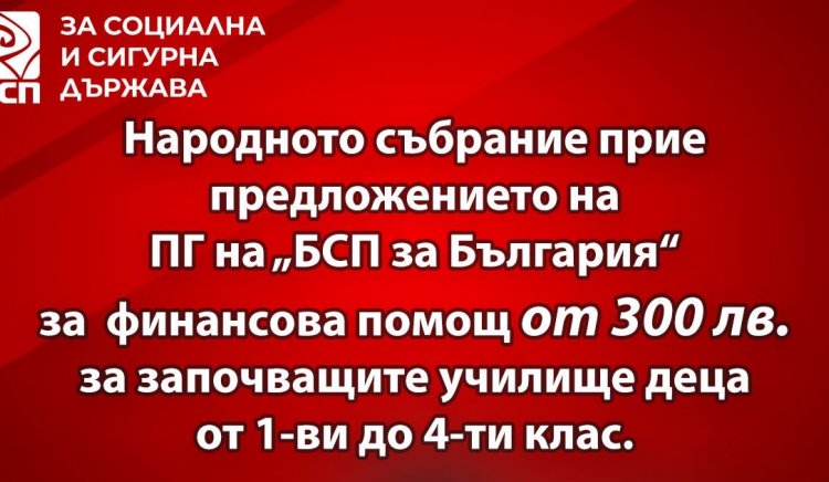 Окончателно на второ четене Народното събрание прие предложението на БСП еднократната помощ от 300 лв. да обхване учениците от първи, втори, трети и четвърти клас. След безплатните детски градини и безплатни учебници, още едно добро решение за децата и семействата. Всяко дете трябва да има шанс да учи. Качественото образование е гаранция за реализацията на младите хора.