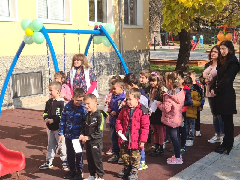 Монтирани са нови беседки, пързалки, люлки и катерушки в двора на детската градина, които са съобразени с ергономичните изисквания за ползването им от децата и с наредба от 12.01.2009 г. за условията и реда за устройството и безопасността на площадките за игра. Под съоръженията е положена бетонова настилка, върху която е направена саморазливна ударопоглъщаща настилка, гарантираща безопасното използване на съоръженията от малчуганите.