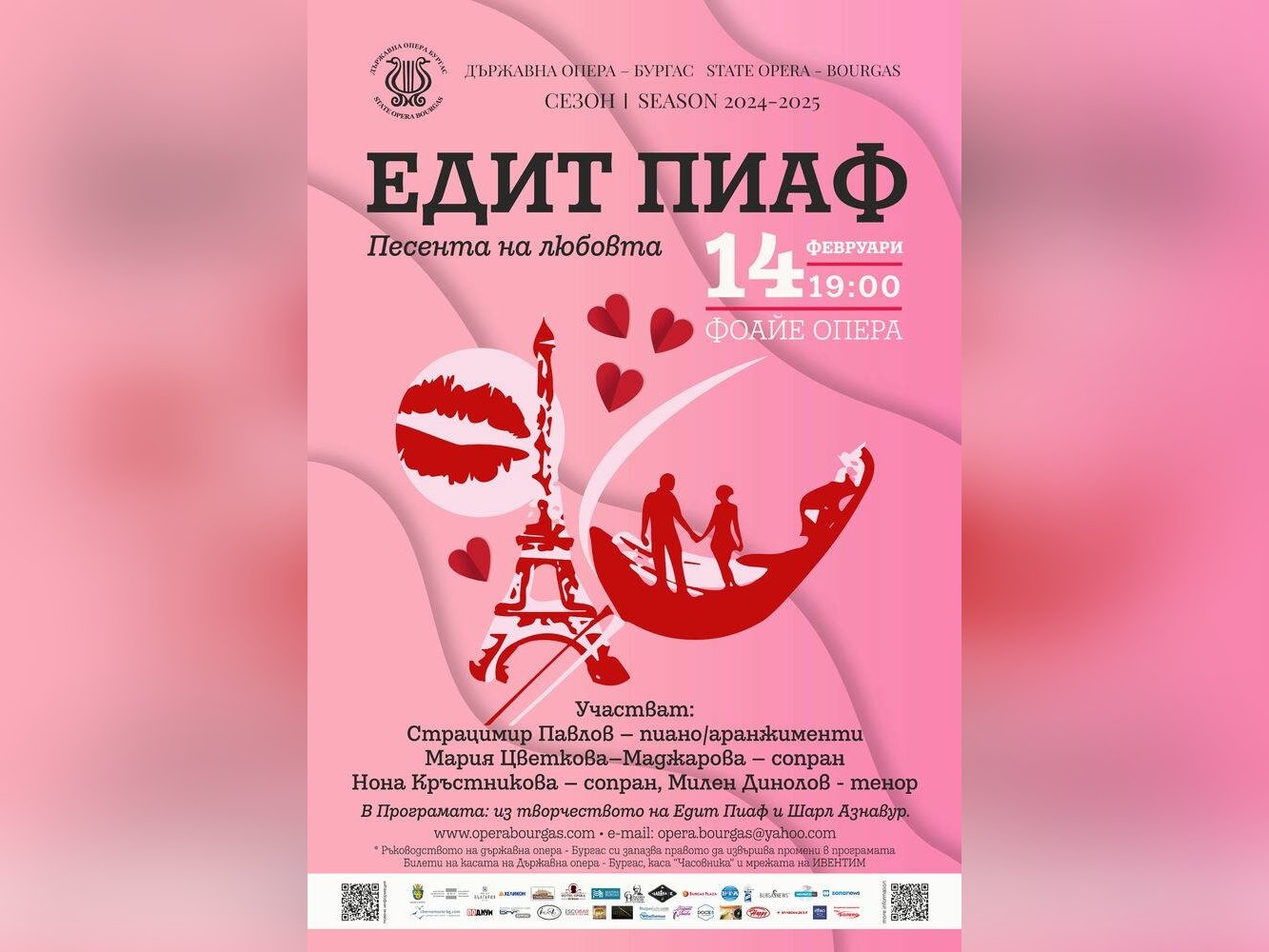 Концерт под наслов "Едит Пиаф - песента на любовта" представя на 14 февруари Бургаската опера. Във фоайето на културния институт солистите Мария Цветкова-Маджарова, Нона Кръстникова и Милен Динолов, в съпровод на рояла от Страцимир Павлов, ще предложат музикална програма, в която ще бъде съчетано творчеството на Едит Пиаф и на Шарл Азнавур.
