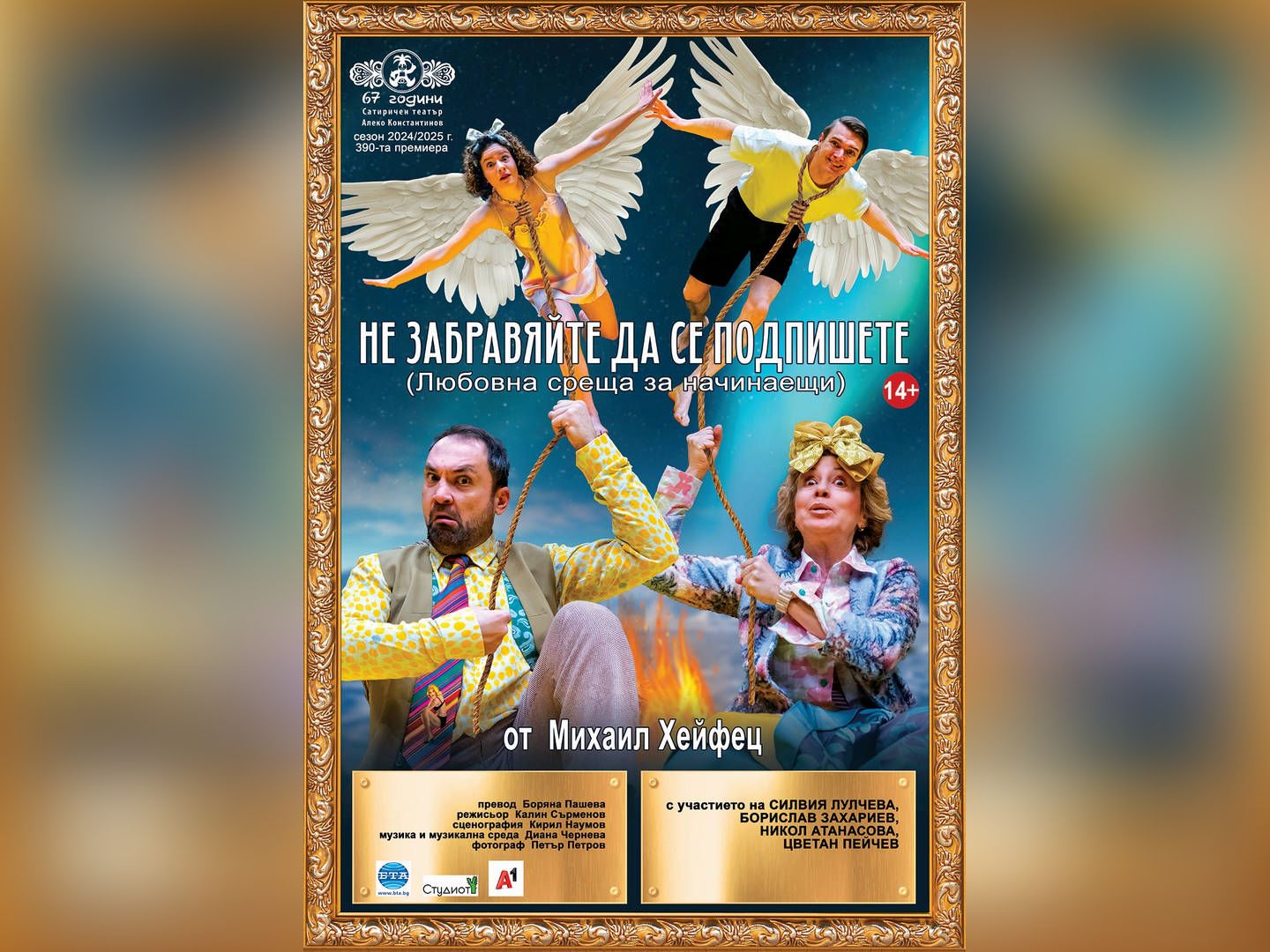 "Не забравяйте да се подпишете (Любовна среща за начинаещи)" 14+ от Михаил Хейфец ще има премиера на 25 януари от 19,30 ч. в Сатиричния театър "Алеко Константинов", научи ДУМА от Мирослава Воронова, експерт връзки с обществеността на театъра. Преводът е на Боряна Пашева, режисьор е Калин Сърменов, сценография - Кирил Наумов, музика и музикална среда - Диана Чернева. Ролите изпълняват: Силвия Лулчева, Борислав Захариев, Никол Атанасова и Цветан Пейчев. Драматург на постановката е Богдана Костуркова, помощник-режисьори - Ива Станчева, Елица Мутафчиева, фотограф Петър Петров.