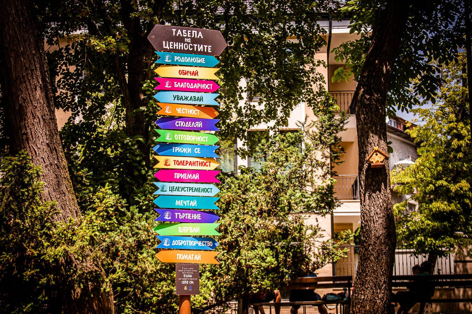 Двуметровата инсталация, поставена до детска площадка в града, е със счупени и отлепени елементи в долната част, представляващи цветни стрелки с изписани ценности.
