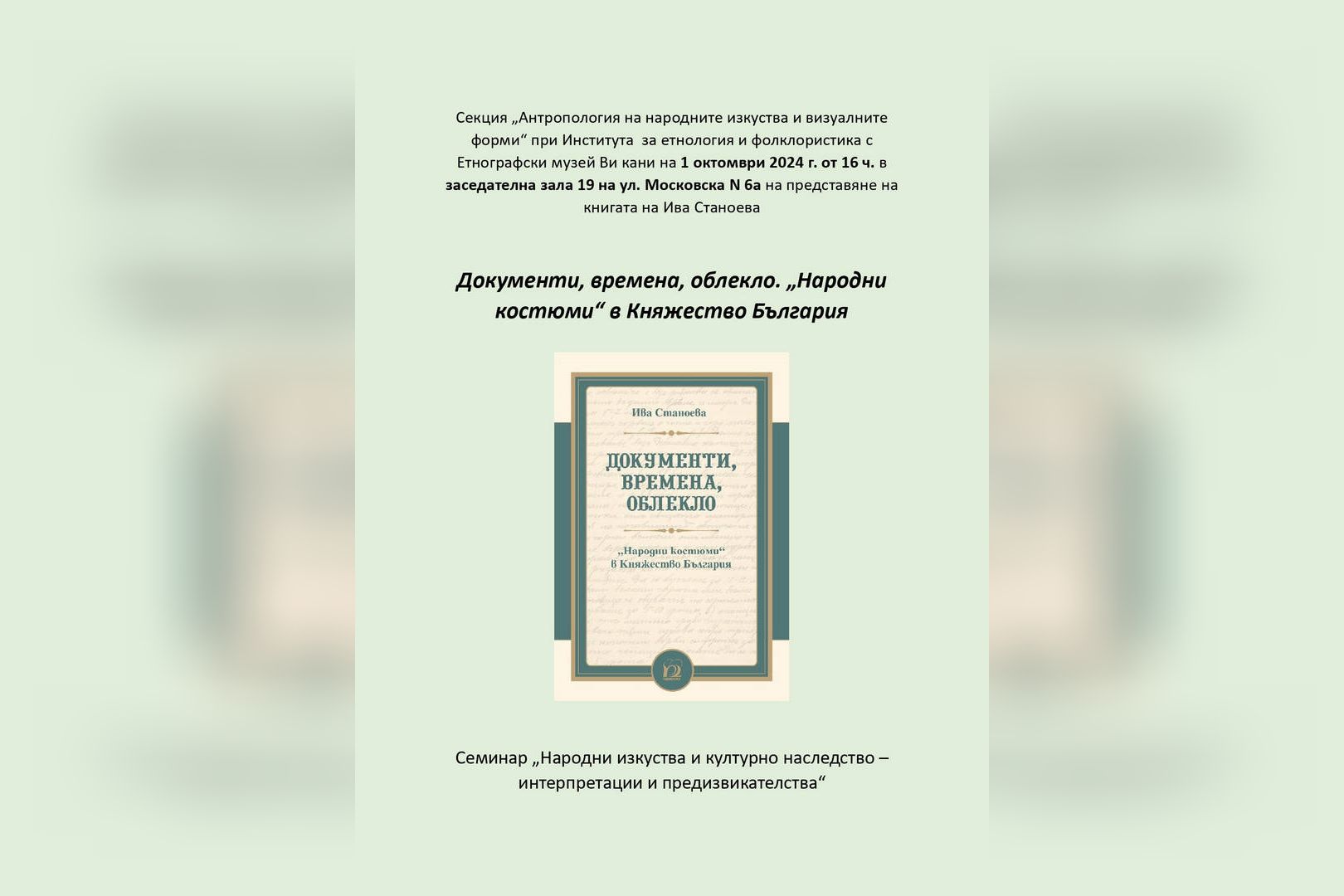Секция "Антропология на народните изкуства и визуалните форми" при Института за етнология и фолклористика с Етнографски музей - БАН кани на 1 октомври от 16 ч. в заседателна зала 19 на ул. "Московска" 6а на представяне на книгата на гл. ас. д-р Ива Станоева "Документи, времена, облекло. Народни костюми в Княжество България", излязла от печат в издателство "Парадигма". Книгата е посветена на ценен извор за историята на традиционното облекло от 1888-1889 г., съхраняван във фонда на проф. Иван Шишманов при Научния архив на Българската академия на науките. Изследването е насочено към широк кръг специалисти, работещи в областта на фолклористиката, антропологията, етнологията, езикознанието, историята, архивистиката, културологията и др., както и към всички, които се интересуват от облеклото, езика, културата и живота в България в края на XIX в.