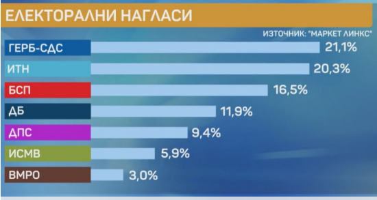 ГЕРБ биха получили около 21% от гласовете, а "Има такъв народ" - около 20%. БСП са трета политическа сила със 16,5 на сто, „Демократична България“ изпреварват ДПС. За ДБ биха гласували 11,9 на сто от запитаните, а за ДПС – 9,4 на сто. "Изправи се, мутри вън" са със 5,9 на сто. ВМРО отново остават под чертата с 3 процента.