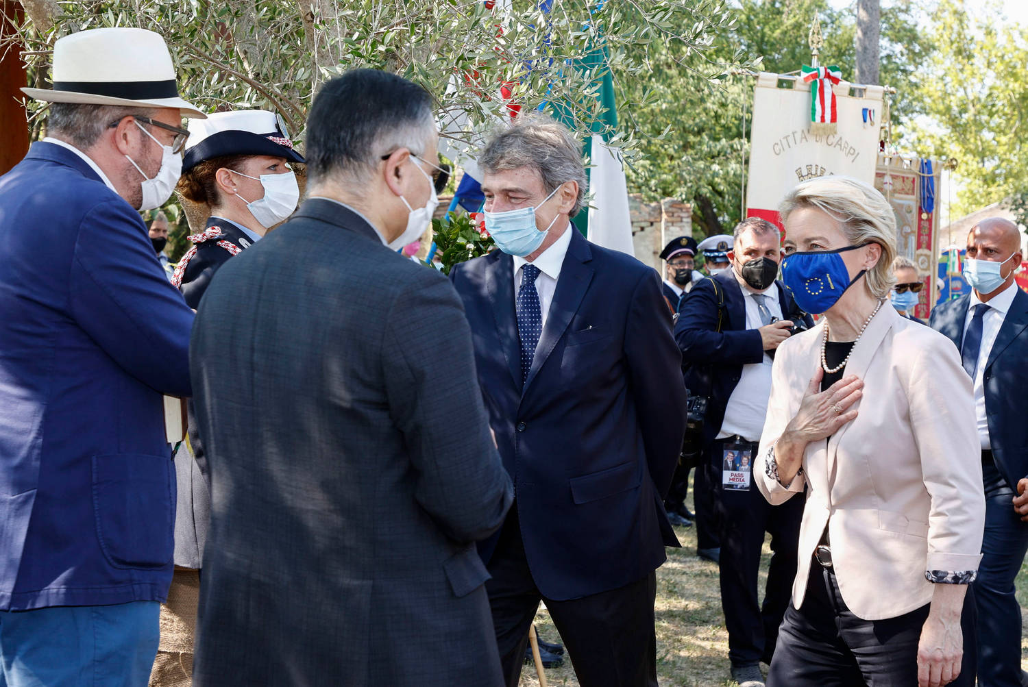 Лидерката на Еврокомисията Урсула фон дер Лайен и председателят на Европарламента Дейвид Сасоли (до нея) по време на обществено събитие в Италия. Двамата са сред най-разпознаваемите антируски хардлайнери в ЕС