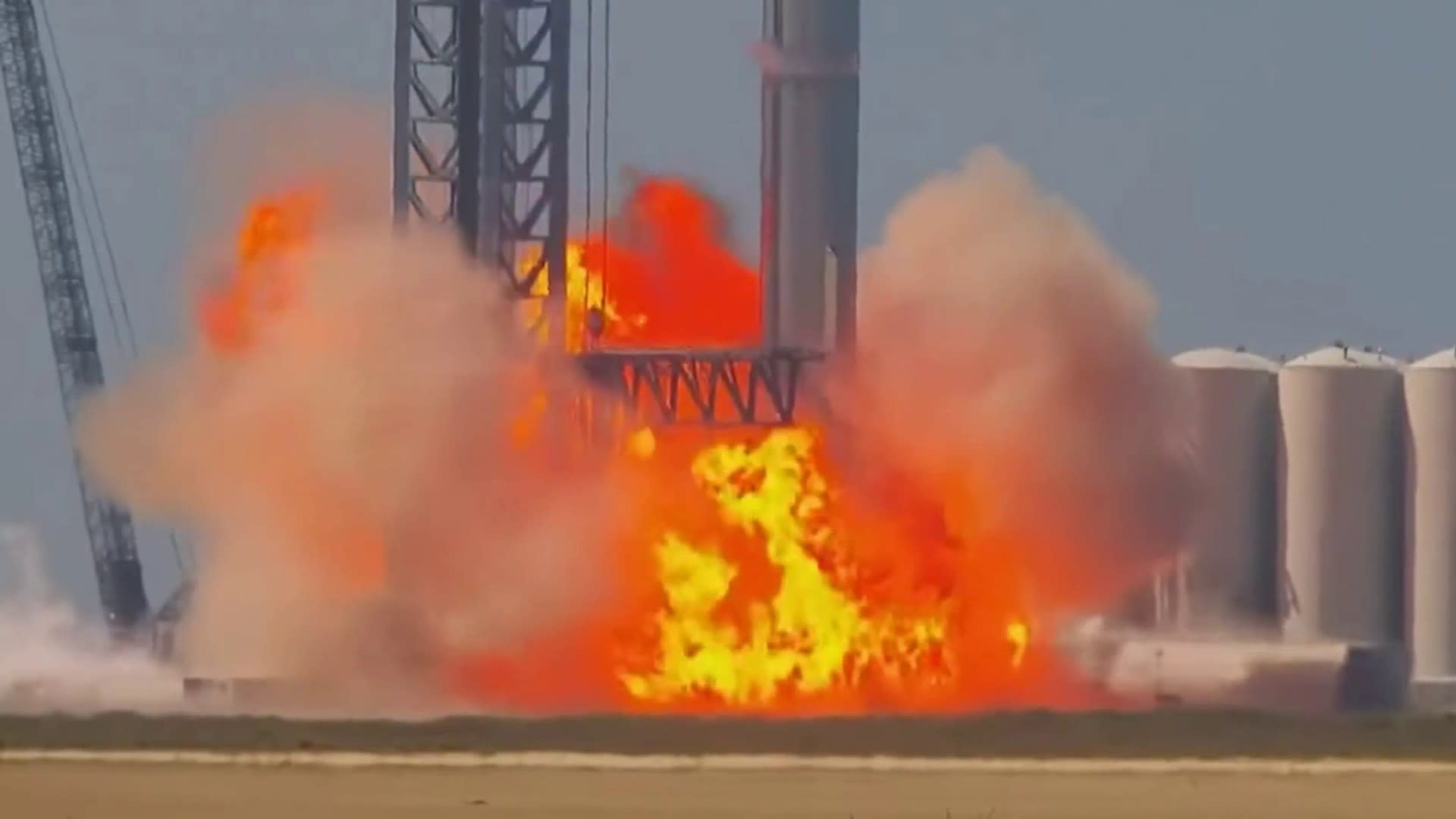 Ракета-носител, разработена от SpaceX на Илън Мъск за нейния космически кораб Starship от следващо поколение, избухна в пламъци по време на наземно тестово изстрелване в понеделник в Тексас, което вероятно пречи на целта на Мъск да изведе Starship в орбита тази година.