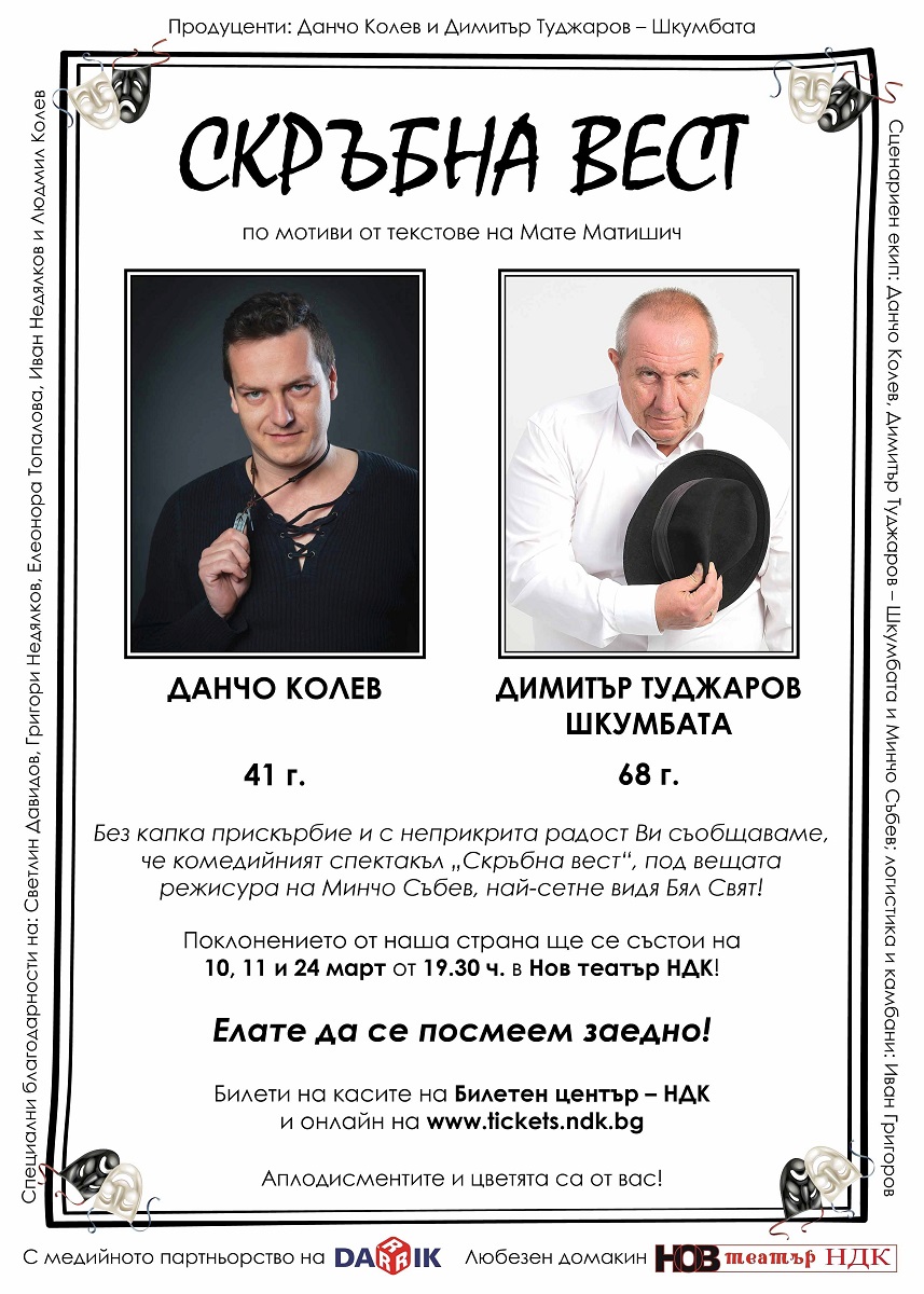 Без капка прискърбие и с неприкрита радост ви съобщаваме, че комедийният спектакъл "Скръбна вест", под вещата режисура на Минчо Събев, най-сетне видя Бял свят. Поклонението от наша страна ще се състои на 10, 11 и 24 март от 19,30 ч. в Нов театър - НДК. Елате да се посмеем заедно! Аплодисментите и цветята са от вас. Това гласи поканата от екипа на постановката.