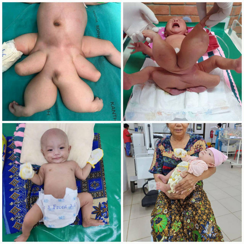 Лекари от болница Кунтбофа в Камбоджа направиха операция на бебе с четири ръце и четири крака. Интервенцията е преминала успешно според хирурзите. Детето се чувства добре, а родителите му нямат търпение да го отведат вкъщи