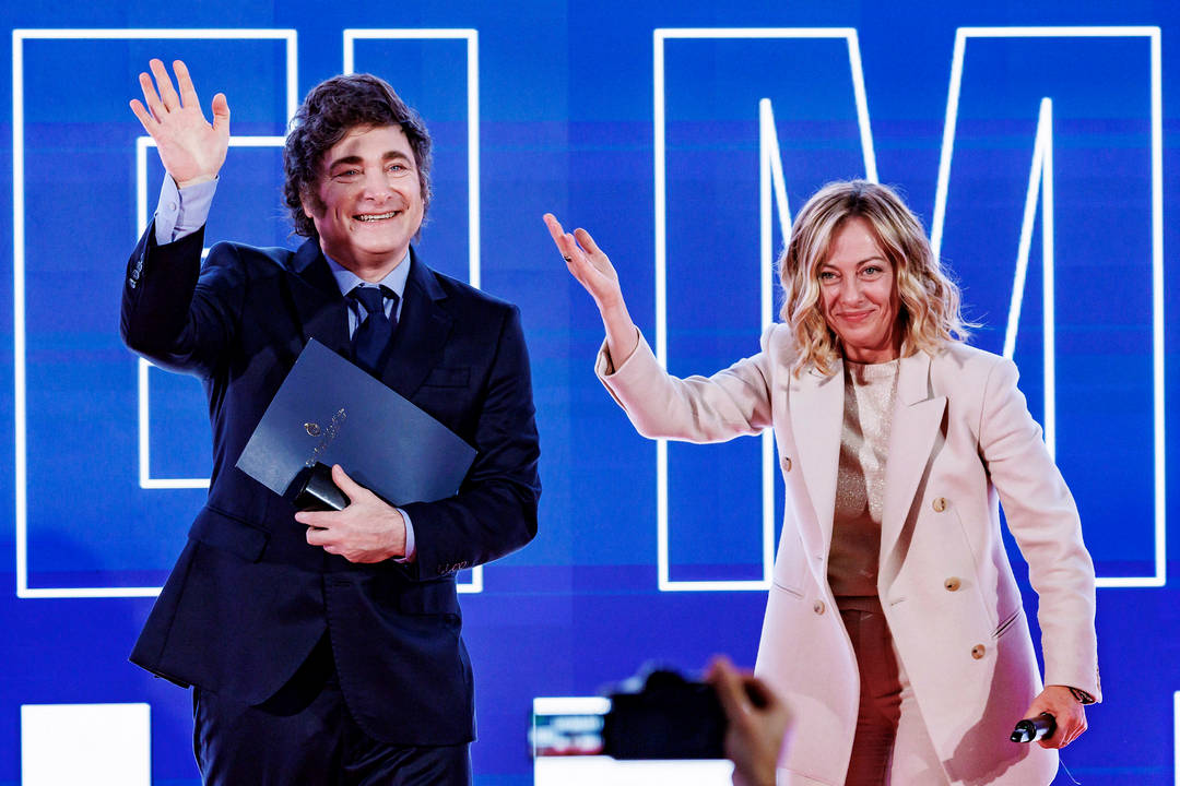 Аржентинският президент Хавиер Милей е специален гост на четиридневната годишна конференция "Атрею" на партията на премиерката Джорджа Мелони "Италиански братя". Либертарианецът получи италианско гражданство, след като правителството започна ускорена процедура за установяване на корените му