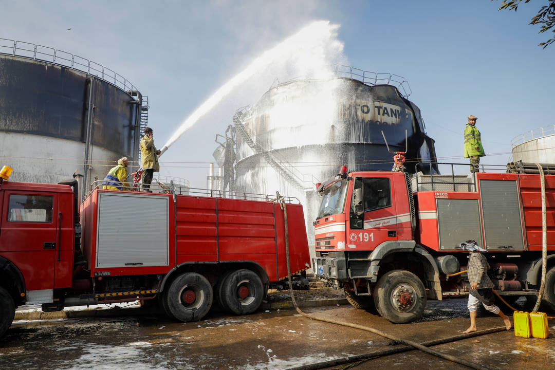 Пожарникари се борят с последиците от ударена от израелска ракета бензиностанция в йеменската столица. Израел обстреля Сана и пристанищния град Ходейда заради ракетен удар от хутите. Деветима души са загинали от израелските атаки