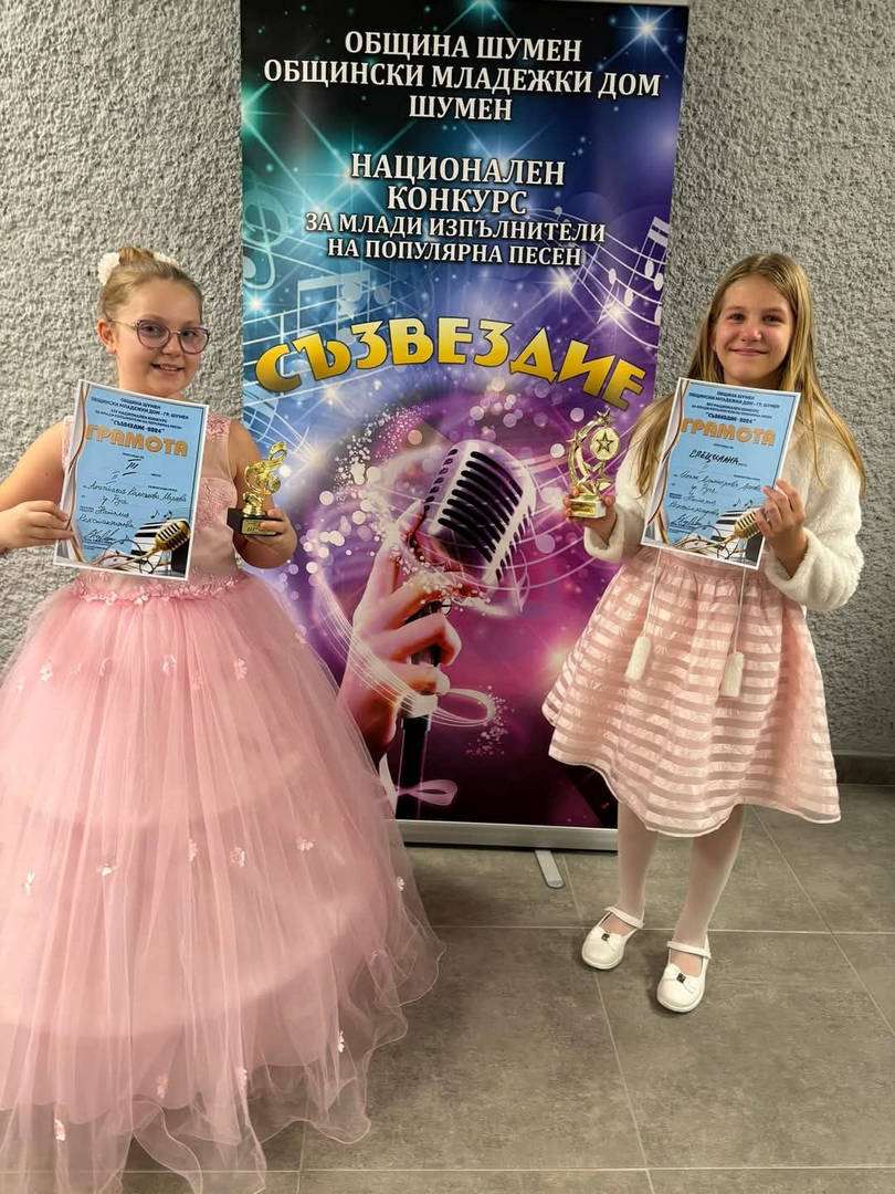 Анастасия Маркова и Йоана Донева от Детската вокална група „Слънце“ при Общинския детски център за култура и изкуство в Русе спечелиха награди на XIV Национален конкурс за млади изпълнители на популярна песен "Съзвездие 2024", който се проведе в Шумен