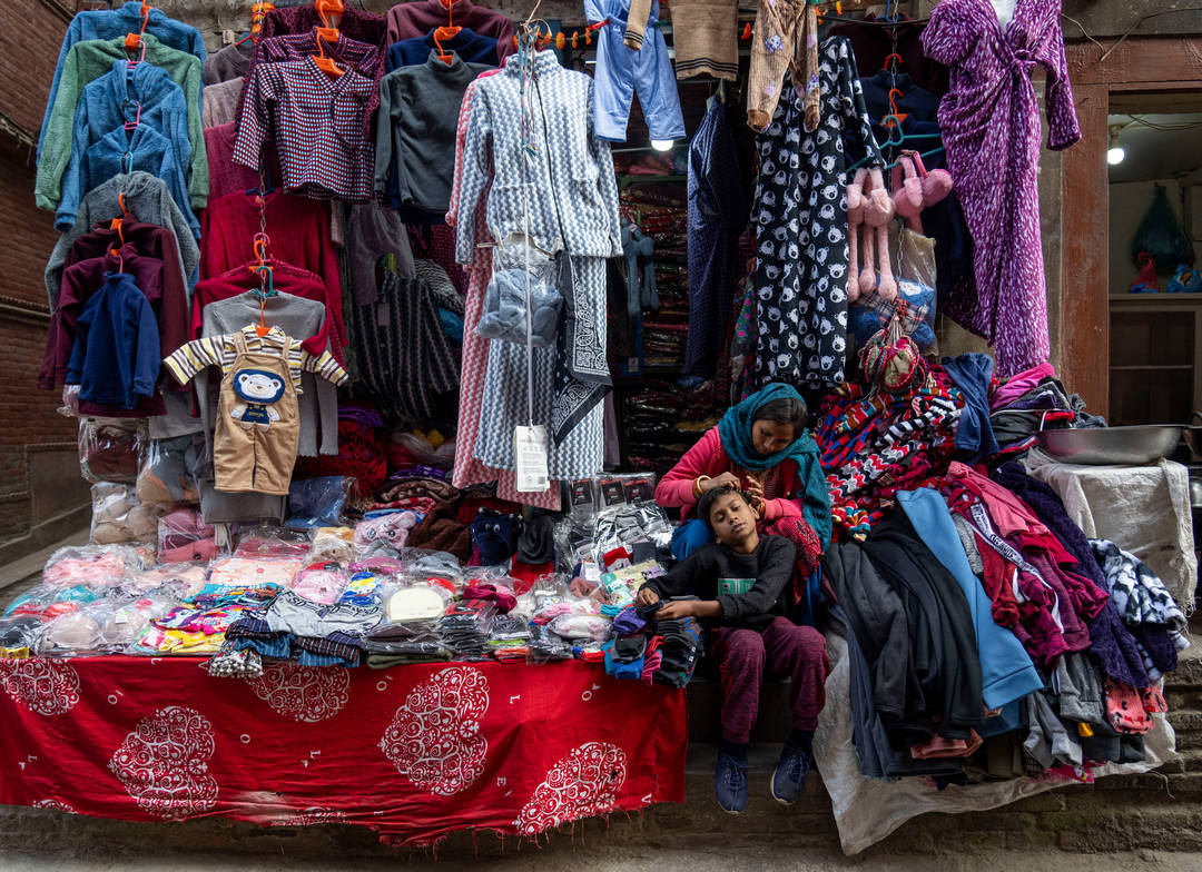 Улична продавачка в Непал преглежда сина си за въшки, докато чака клиенти