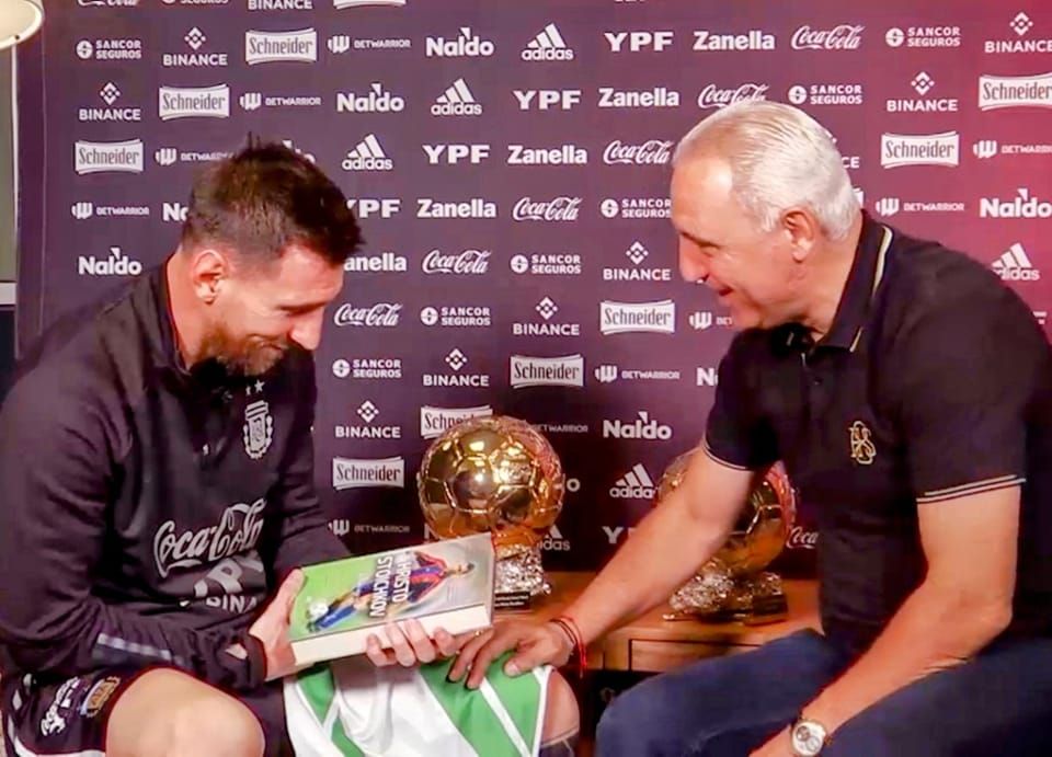 Ицо Стоичков подарява книгата си на Лео Меси