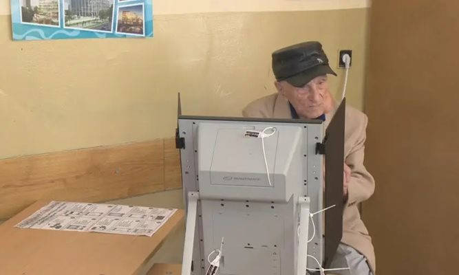 Най-възрастният избирател във Варна гласува машинно в училище" Ал. С. Пушкин". Хиньо Коларов е на 104 години и никога не е пропускал да даде своя вот. Казва, че досега е гласувал близо 100 пъти.