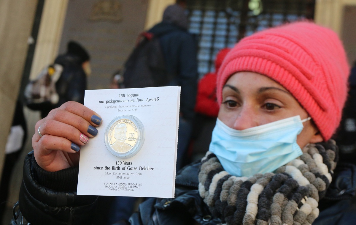 Огромна опашка се образува пред сградата на БНБ, където вчера започна продажбата на монетата, посветена на 150 години от рождението на Гоце Делчев. Гражданите, сред които преобладаваха млади хора, чакаха да си купят сребърната монета с номинал от 10 лева. Това е първата монета, която БНБ пуска тази година. Тя е отсечена в тираж от 3000 броя и е с проба 999/1000. Теглото й е 23,33 грама и се продава за 108 лева.