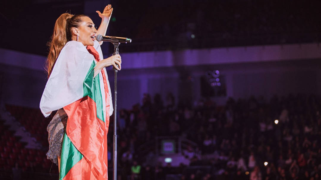 Клипове от социалните мрежи показват как певицата опъва родния ни трибагреник, върху който е зашит нейният лик. След това се завива с него и продължава да пее. В залата обаче се чуват бурни освирквания, а някои от посетителите я напуснали.