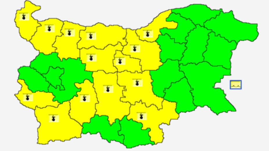 Жълтият код важи за областите Кюстендил, Благоевград, Пазарджик, Пловдив, Стара Загора, Хасково, Габрово, Велико Търново, Русе, Ловеч, Плевен, Враца, Монтана и Видин.
