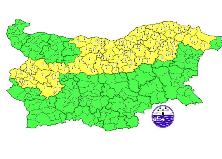 Жълт код за потенциално опасно време и много ниски температури е обявен в 13 области на страната – София област, София град, Перник, Ловеч, Плевен, Велико Търново, Габрово, Търговище, Русе, Разград, Шумен, Силистра и Добрич. В тези райони се очакват минимални температури от -9 до -14 градуса. Максималните температури ще са между минус 1° и 4°, в София – около минус 1°.
