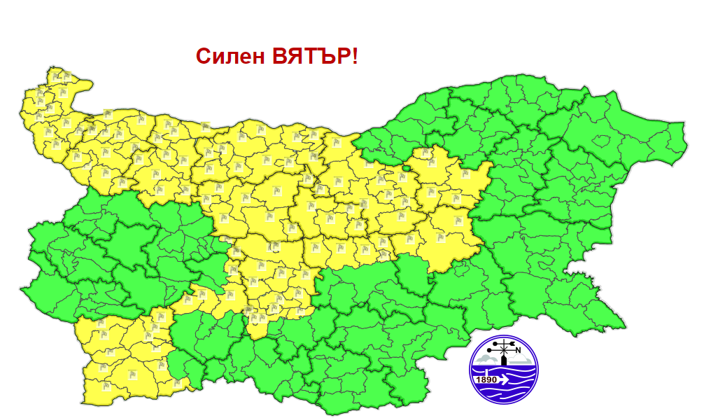 Жълт код за силен вятър е обявен за утре в 13 области в страната. Предупреждението важи за Видин, Монтана, Враца, Плевен, Ловеч, Габрово, Велико Търново, Търговище, Сливен, Стара Загора, Пловдив, Пазарджик и Благоевград, съобщават от НИМХ.