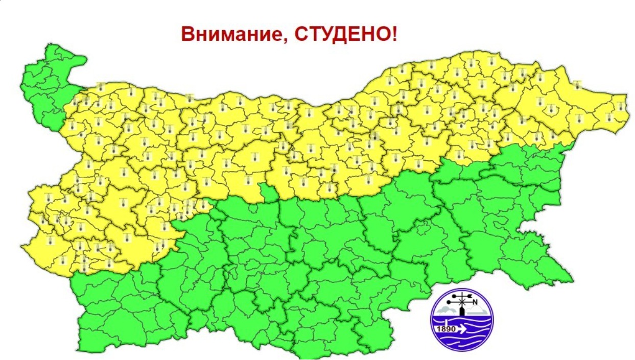 Жълт код за студено време и ниски температури е обявен за сряда в 17 области в страната. Това са София-град, София-област, Видин, Перник, Кюстендил, Враца, Монтана, Ловеч, Плевен, Велико Търново, Габрово, Русе, Търговище, Шумен, Силистра, Варна, Добрич, предупреждават от НИМХ.