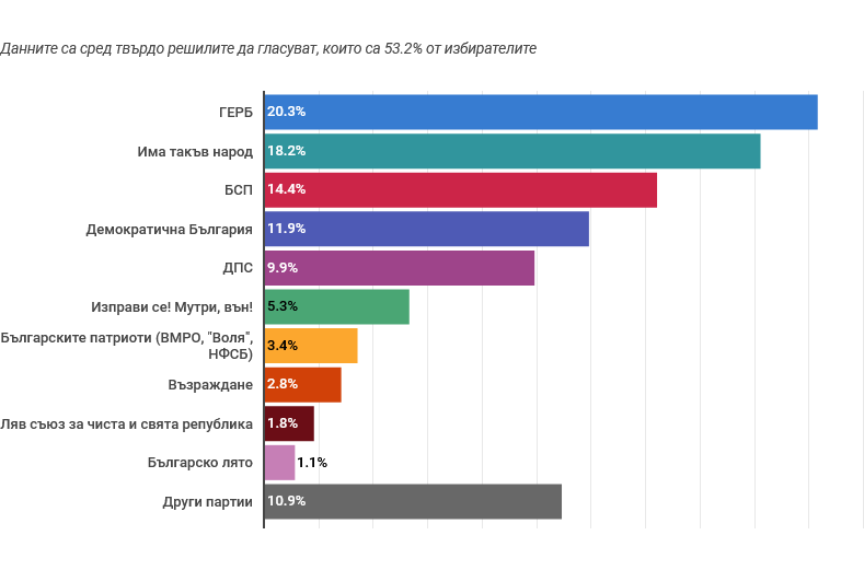 Подкрепата за ГЕРБ - СДС е 20.3%, а за "Има такъв народ" - 18.2%. БСП получава 14.4% от гласовете на тези, които са решили да отидат до урните. Четвърта е "Демократична България" с 11.9%, ДПС остава пета с 9.9% подкрепа, а доверието за "Изправи се! Мутри вън!" е 5.3%. Обединението между ВМРО, НФСБ и "Воля" събира 3.4% и засега остава извън парламента.