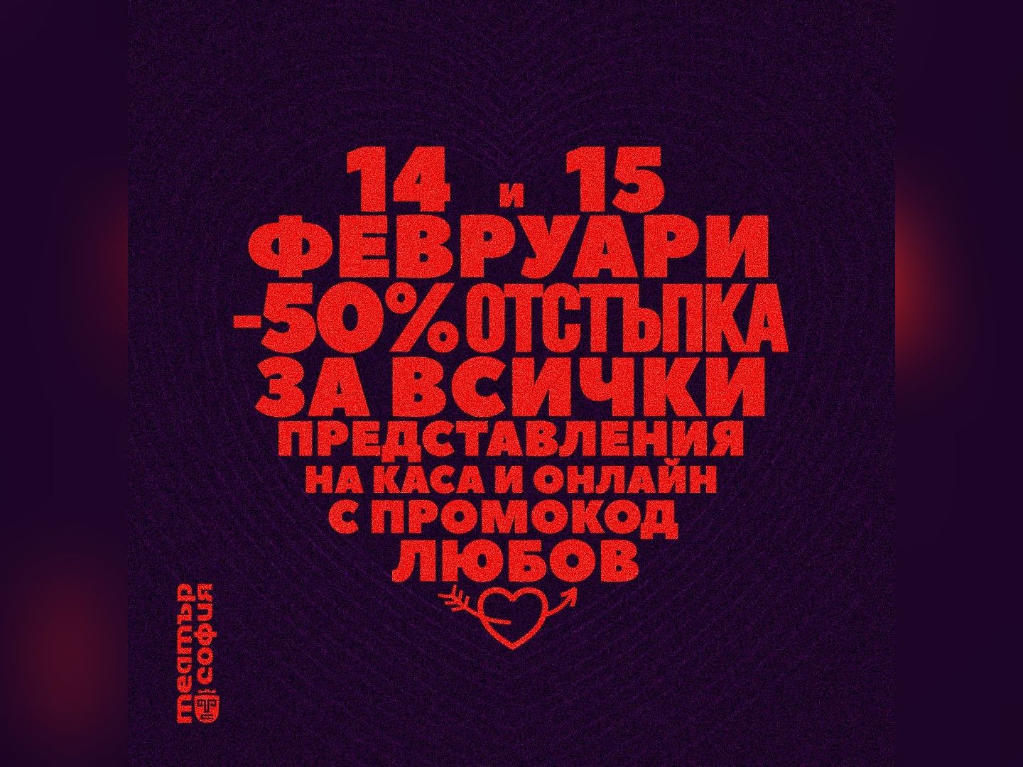 В месеца на любовта правим жест към всички, които обичат театъра. Само на 14 и 15 февруари с промокод ЛЮБОВ може да закупите билети за всички спектакли от репертоара на Театър "София" с 50% отстъпка, съобщават от трупата. Правим го, защото вярваме, че сцената е място за истински срещи, за истории, които ни събират, за вечери, които помним дълго. Правим го, защото любовта заема своето специално място в нашия афиш. А съвсем скоро към репертоара ни ще се присъедини и "Любов и други аварии" (от Александра Славова и Любомира Видева, режисьор Ованес Торосян) - история за търсенето на любовта и вярата в себе си, допълват от екипа. Предложението е валидно онлайн с промокод ЛЮБОВ, като се регистрирате на https://sofiatheatre.eu/ и въведете промокод ЛЮБОВ, изписан с главни букви (промокодът ще бъде активен от 00,01 ч. на 14 февруари до 23,59 ч. на 15 февруари) и на билетната каса на Театър София на ул. "Г. С. Раковски" 129.