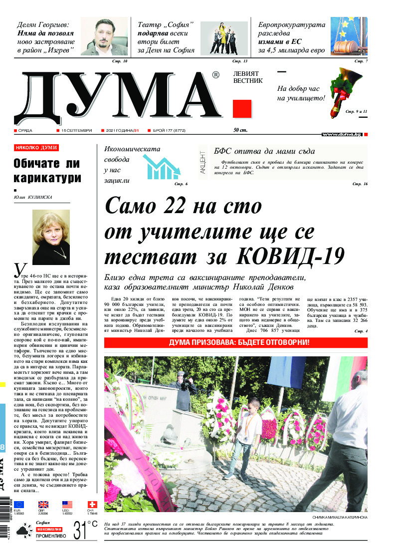 Едва 20 хиляди от близо 90 000 учители у нас са заявили, че искат да бъдат тествани за коронавирус преди учебната година, малко над 30% са ваксинираните, 20% са преболедувалите от КОВИД-19, а едва около 2% от учениците са ваксинирани. Това съобщи в тв участие просветният министър Николай Денков по п...