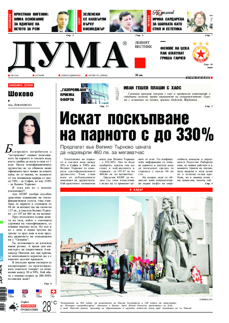 Мая ЙОВАНОВСКАБългарските потребители с "нетърпение" очакват поскъпването на парното и топлата вода, което трябва да влезе в сила от 1 юли. Засега топлофикационните дружества не са обявили нищо официално като заявка за новите цени, но се оказва, че желаното от тях повишение варира от около 30% - за ...