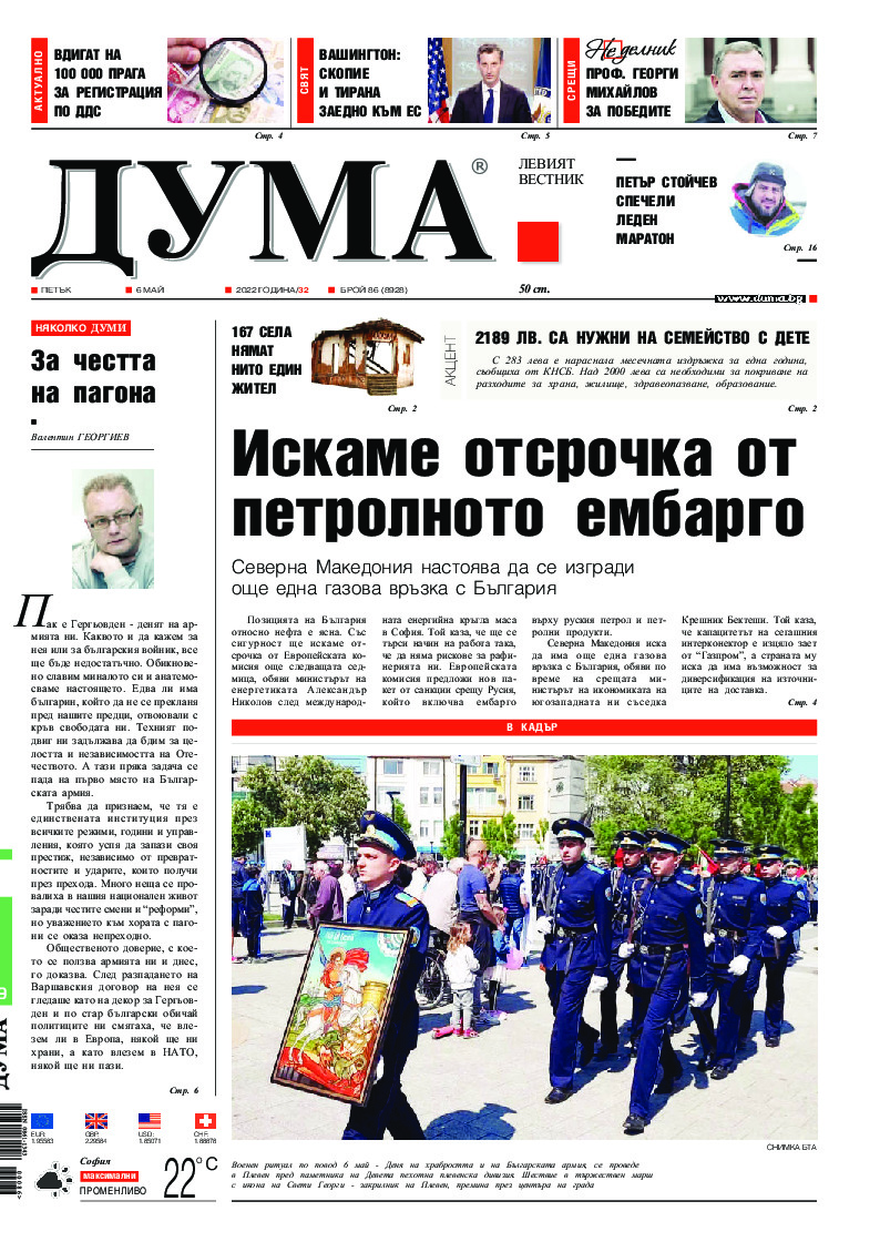 Валентин ГЕОРГИЕВ Пак е Гергьовден - денят на армията ни. Каквото и да кажем за нея или за българския войник, все ще бъде недостатъчно. Обикновено славим миналото си и анатемосваме настоящето. Едва ли има българин, който да не се прекланя пред нашите предци, отвоювали с кръв свободата ни. Техният...