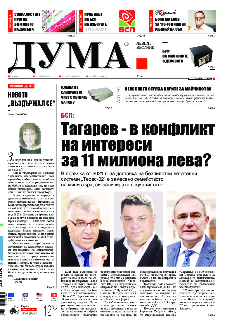 БСП има съмнения за голям конфликт на интереси на семейството на министъра на отбраната Тодор Тагарев с поръчка, обявена от МО през октомври 2021 г. Тя е за доставка на безпилотни летателни системи "Терес-02". Една година и 10 месеца по-късно и само един месец, след като Тагарев поема поста министър...