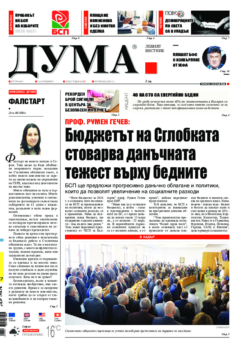 Фалстарт на новото начало в София. Така може да бъде обобщено вчерашното първо заседание на Столичния общински съвет, в който новото мнозинство се зарече да смени модела на управление на ГЕРБ, властвал над десетилетие на местно ниво.Много обещания се чуха в тържествената част на сесията. Много ръкоп...