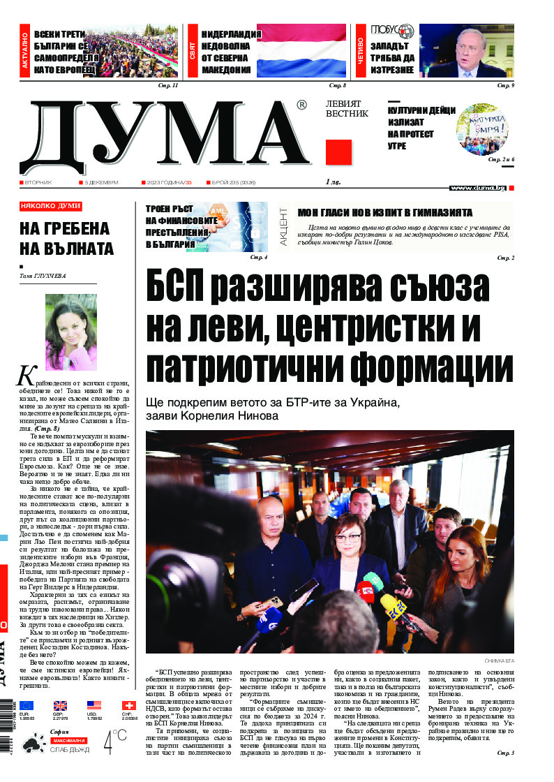 "БСП успешно разширява обединението на леви, центристки и патриотични формации. В общата мрежа от съмишленици се включиха от НДСВ, като форматът остава отворен." Това заяви лидерът на БСП Корнелия Нинова.Тя припомни, че социалистите инициираха съюза на партии съмишленици в тази част на политическото...