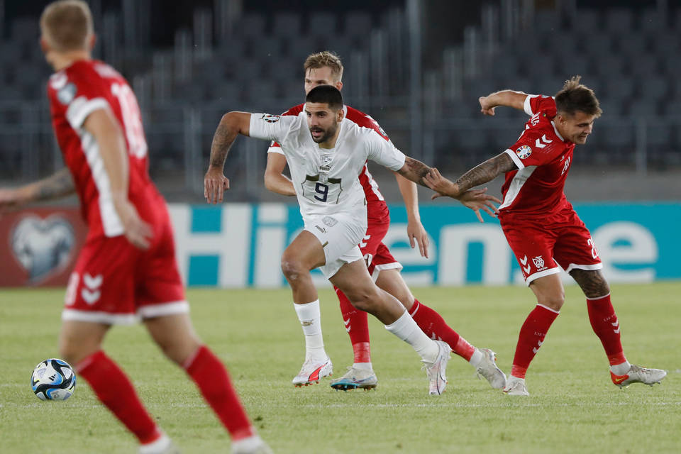 Александър Митрович пази топката от трима играчи на Литва за победата на Сърбия с 3:1 в Каунас, за която нападателят вкара хеттрик за 23 мин. "Плавите" събраха 10 т. и се изравниха на първото място в нашата група с Унгария