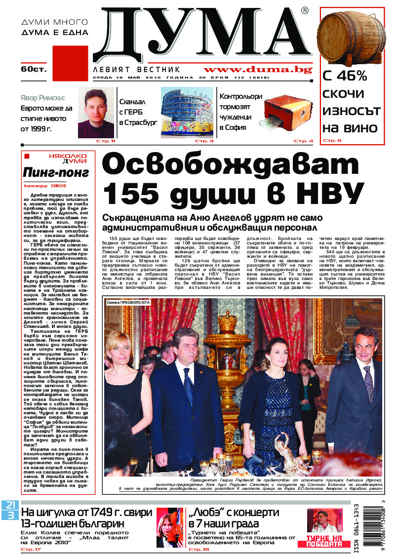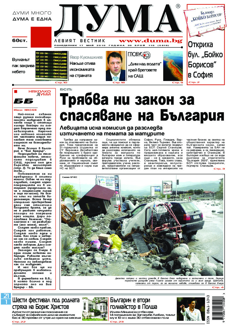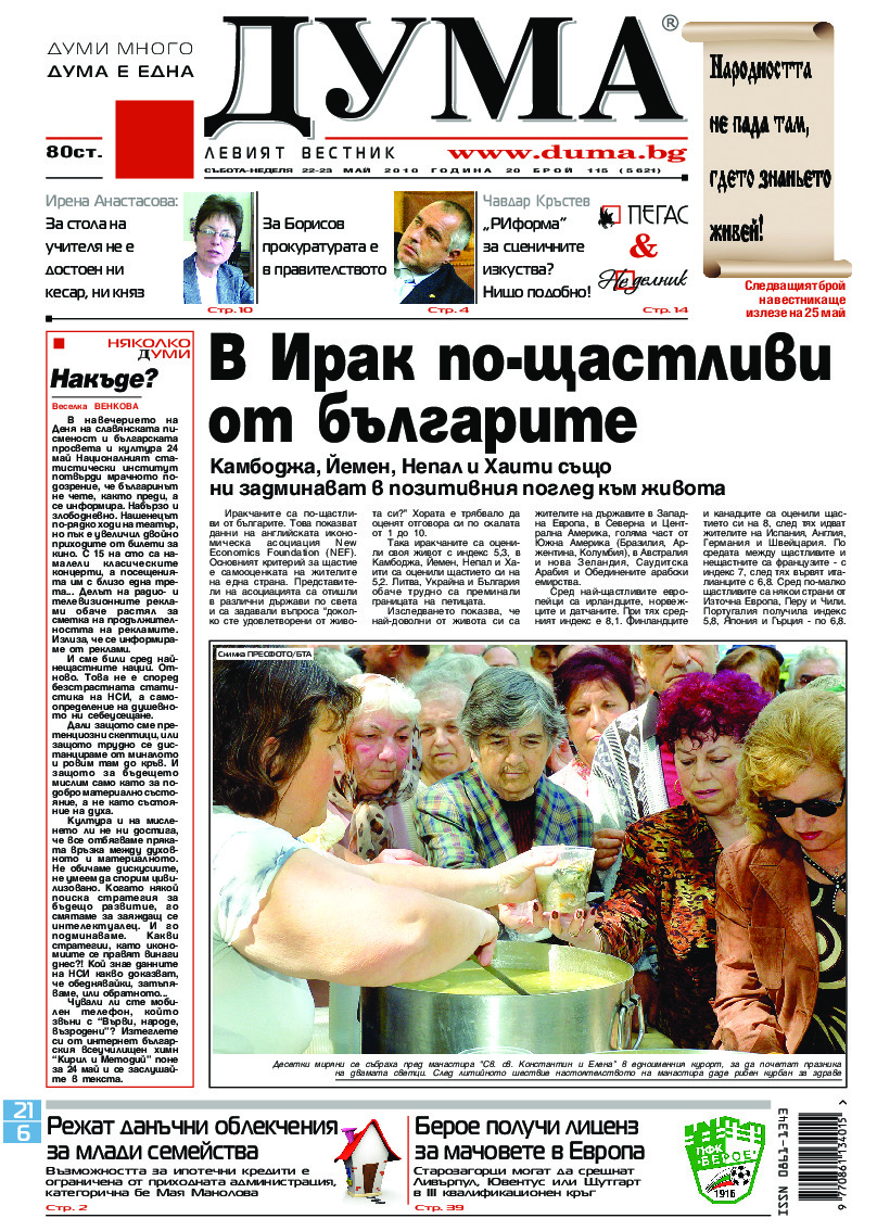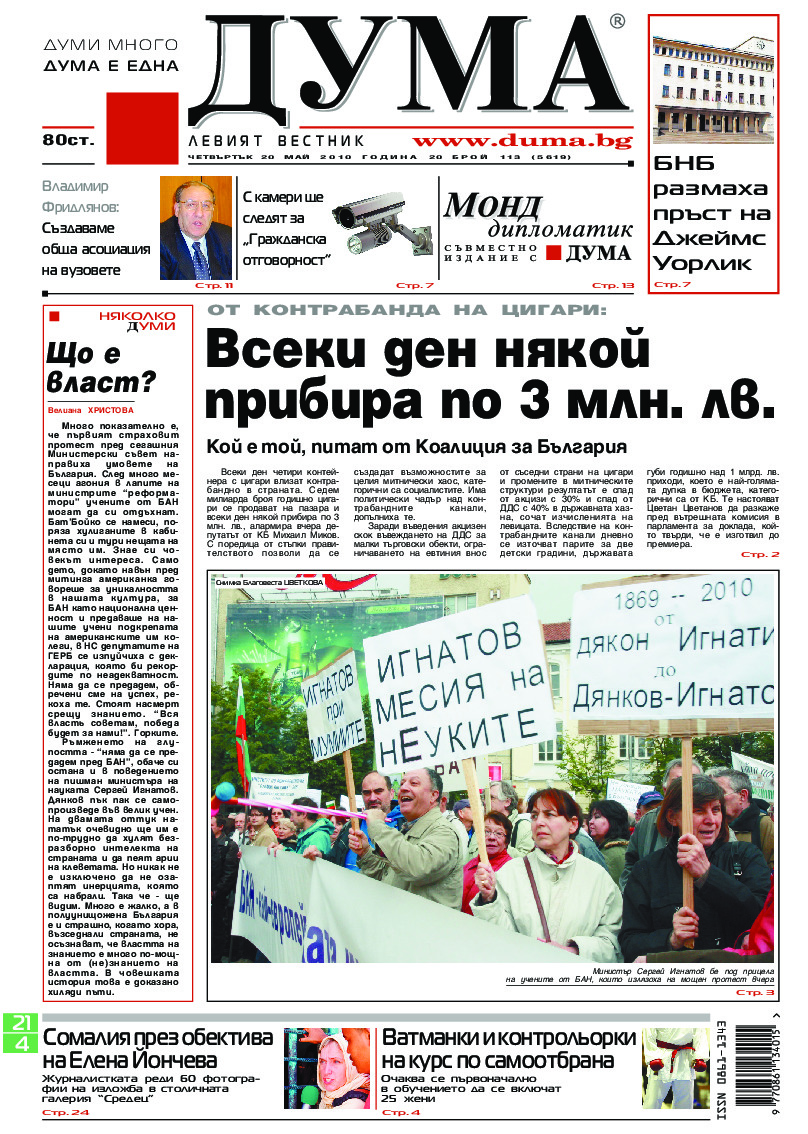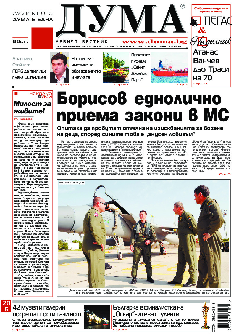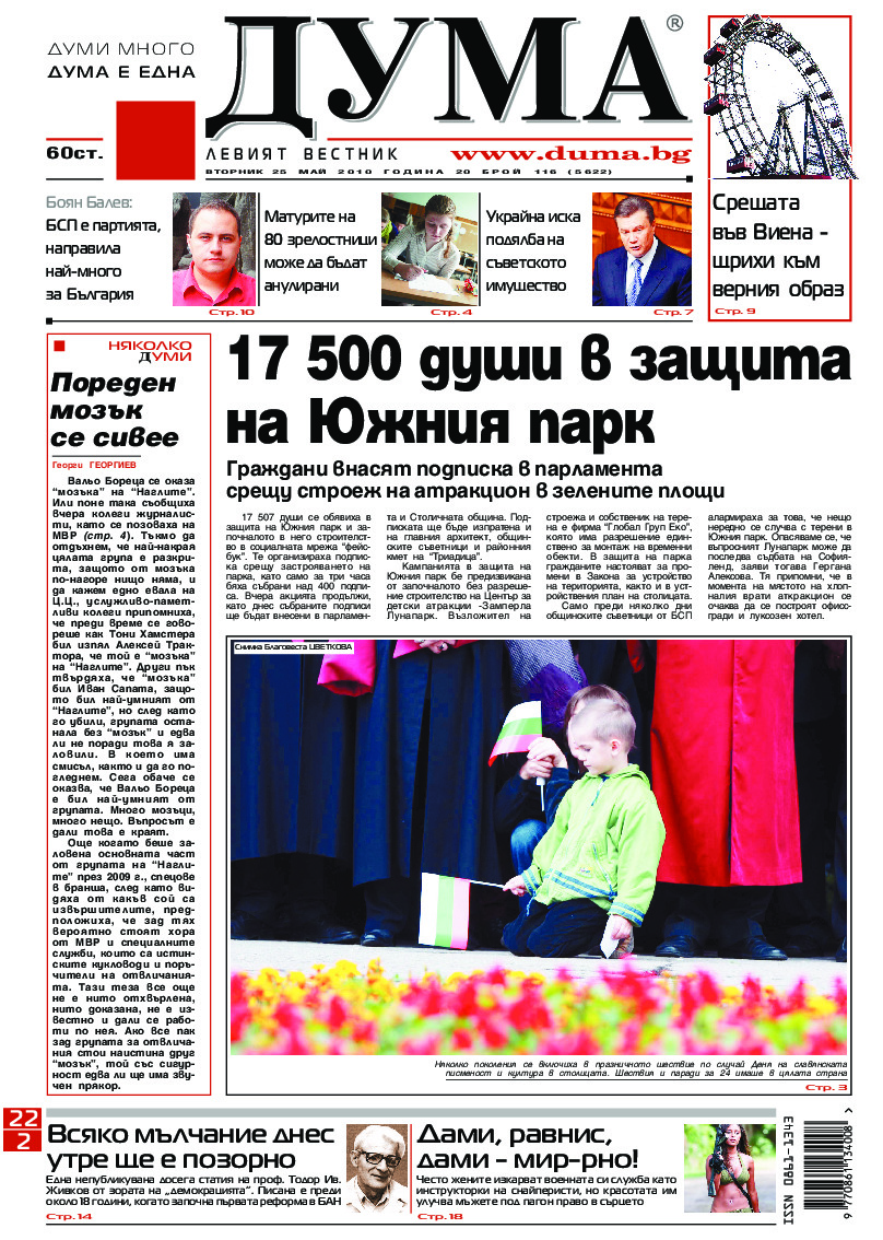 АБОНАМЕНТ за вестник „ДУМА“ за 2026 година. Можете да се абонирате в: „Български пощи“ АД до 15 декември 2025 г., „Доби прес“ ЕООД до 28 декември 2025 г., в редакцията на вестника до 20 декември 2025 г. Каталожен номер 6. Цени: 12 месеца - 149 € / 291,42 лв., 6 месеца - 75 € / 146,69 лв., 3 месеца - 40 € / 78,23 лв., 1 месец - 14 € / 27,38 лв. За повече информация тел. 02 9705 203 и 02 9705 216 отдел „Разпространение” на в-к ДУМА на ул. „Позитано” 20 А. E-mail: abonament@duma.bg АБОНАМЕНТ за вестник „ДУМА“ за 2026 година. Можете да се абонирате в: „Български пощи“ АД до 15 декември 2025 г., „Доби прес“ ЕООД до 28 декември 2025 г., в редакцията на вестника до 20 декември 2025 г. Каталожен номер 6. Цени: 12 месеца - 149 € / 291,42 лв., 6 месеца - 75 € / 146,69 лв., 3 месеца - 40 € / 78,23 лв., 1 месец - 14 € / 27,38 лв. За повече информация тел. 02 9705 203 и 02 9705 216 отдел „Разпространение” на в-к ДУМА на ул. „Позитано” 20 А. E-mail: abonament@duma.bg