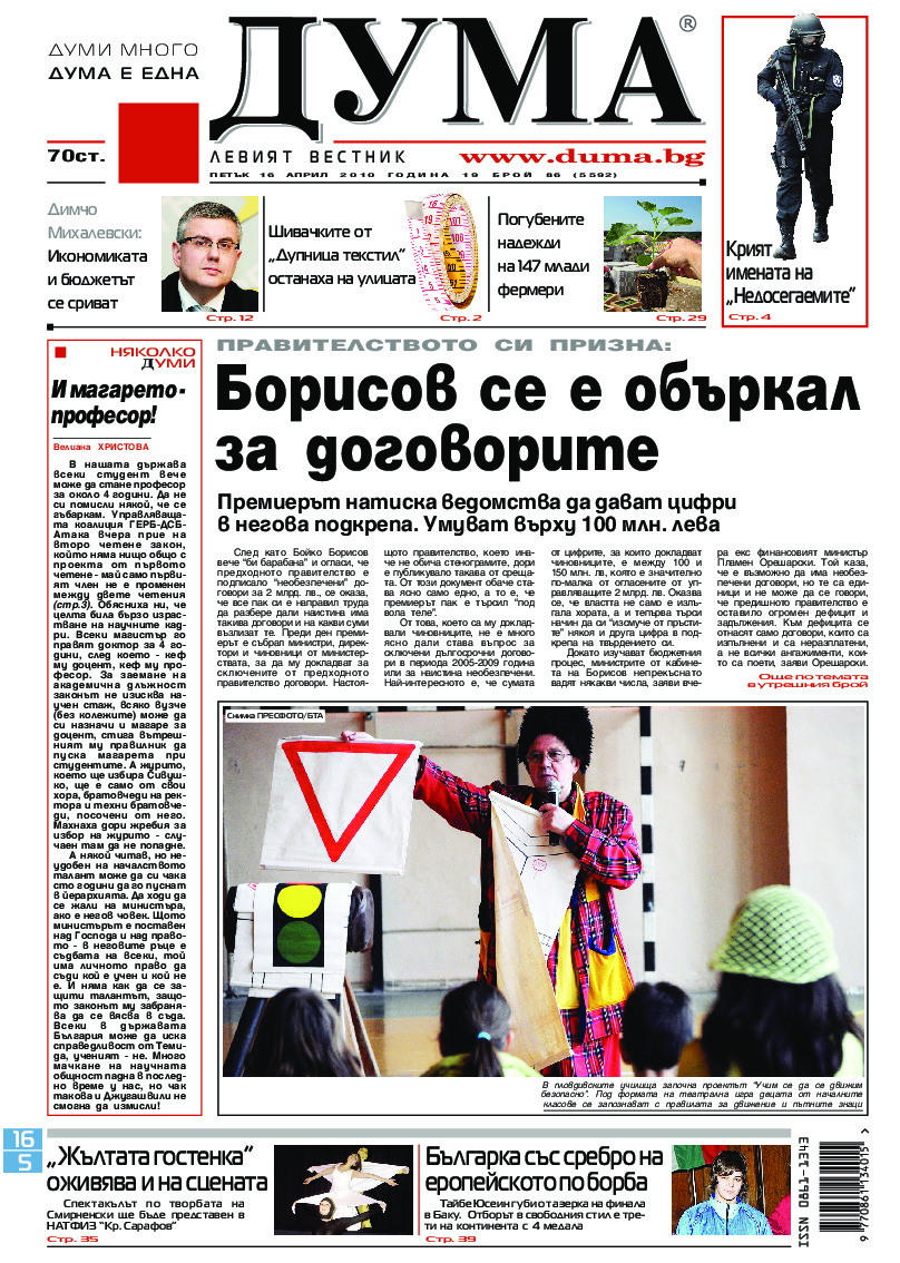 АБОНАМЕНТ за вестник „ДУМА“ за 2026 година. Можете да се абонирате в: „Български пощи“ АД до 15 декември 2025 г., „Доби прес“ ЕООД до 28 декември 2025 г., в редакцията на вестника до 20 декември 2025 г. Каталожен номер 6. Цени: 12 месеца - 149 € / 291,42 лв., 6 месеца - 75 € / 146,69 лв., 3 месеца - 40 € / 78,23 лв., 1 месец - 14 € / 27,38 лв. За повече информация тел. 02 9705 203 и 02 9705 216 отдел „Разпространение” на в-к ДУМА на ул. „Позитано” 20 А. E-mail: abonament@duma.bg АБОНАМЕНТ за вестник „ДУМА“ за 2026 година. Можете да се абонирате в: „Български пощи“ АД до 15 декември 2025 г., „Доби прес“ ЕООД до 28 декември 2025 г., в редакцията на вестника до 20 декември 2025 г. Каталожен номер 6. Цени: 12 месеца - 149 € / 291,42 лв., 6 месеца - 75 € / 146,69 лв., 3 месеца - 40 € / 78,23 лв., 1 месец - 14 € / 27,38 лв. За повече информация тел. 02 9705 203 и 02 9705 216 отдел „Разпространение” на в-к ДУМА на ул. „Позитано” 20 А. E-mail: abonament@duma.bg
